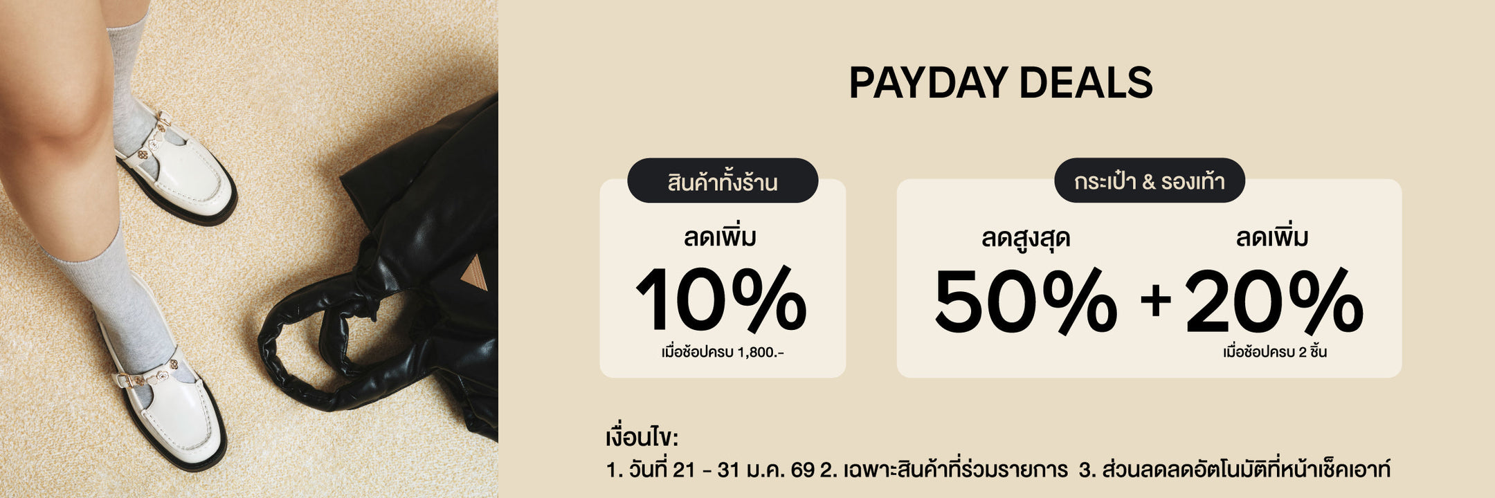 ช้อปรองเท้า หรือ กระเป๋า 2 ชิ้นลดเพิ่ม 20% + ช้อปครบ 1,800 ลดเพิ่ม 10%